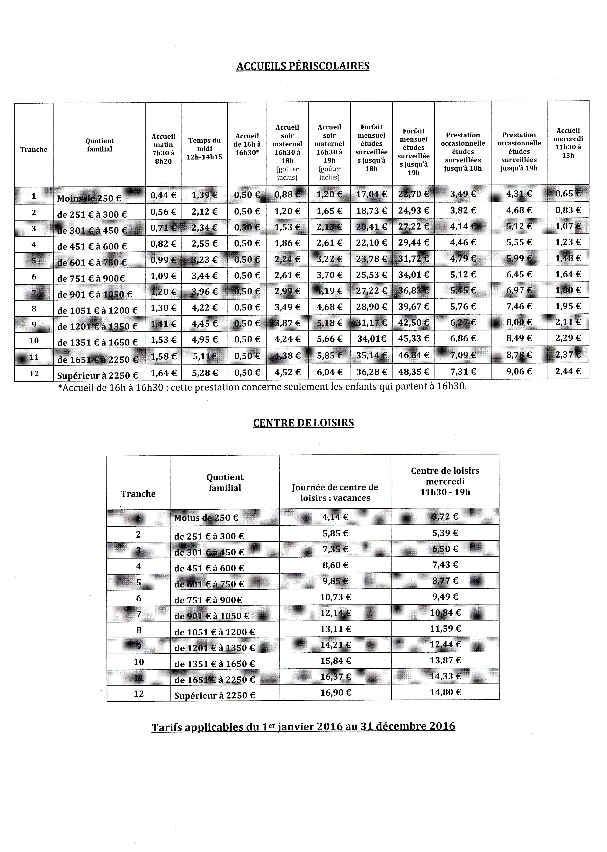 Cette semaine, l’école vous a fait suivre un courrier de la mairie vous donnant les nouveaux tarifs périscolaires qui seront à prendre en compte à partir du 01/01/2016.